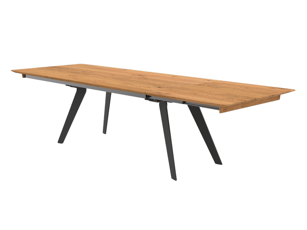 Der Tischauszug ermöglicht eine Verlängerung bis zu 240 cm und bietet einen komfortablen Synchronauszug mit 80 cm Klappeneinlage; zusätzliche Auszugsgrößen zwischen 60 und 100 cm im 5-cm-Raster sind auf Wunsch ebenfalls realisierbar.