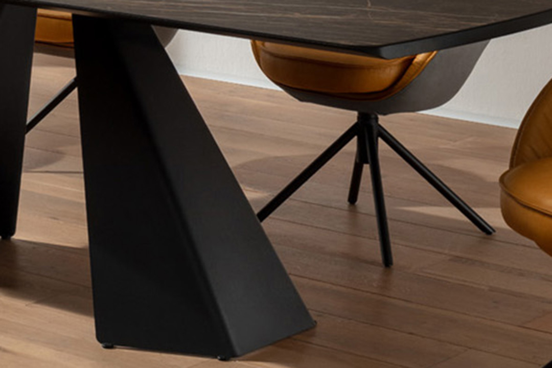 Das Gestell in Schrägwange gekantet setzt mit seiner klaren Linienführung und der präzise gebogenen Kante ein markantes, modernes Designstatement.